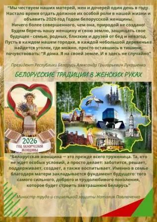 «Мы чествуем наших матерей, жен и дочерей один день в году. Настало время отдать должное их особой роли в нашей жизни и объявить 2026 год Годом белорусской женщины. Ничего более совершенного, чем она, природой не создано! Будем беречь нашу женщину и свою землю, защищать свое будущее — семью, родных, близких и друзей от бед и невзгод», — сказал Александр Лукашенко.