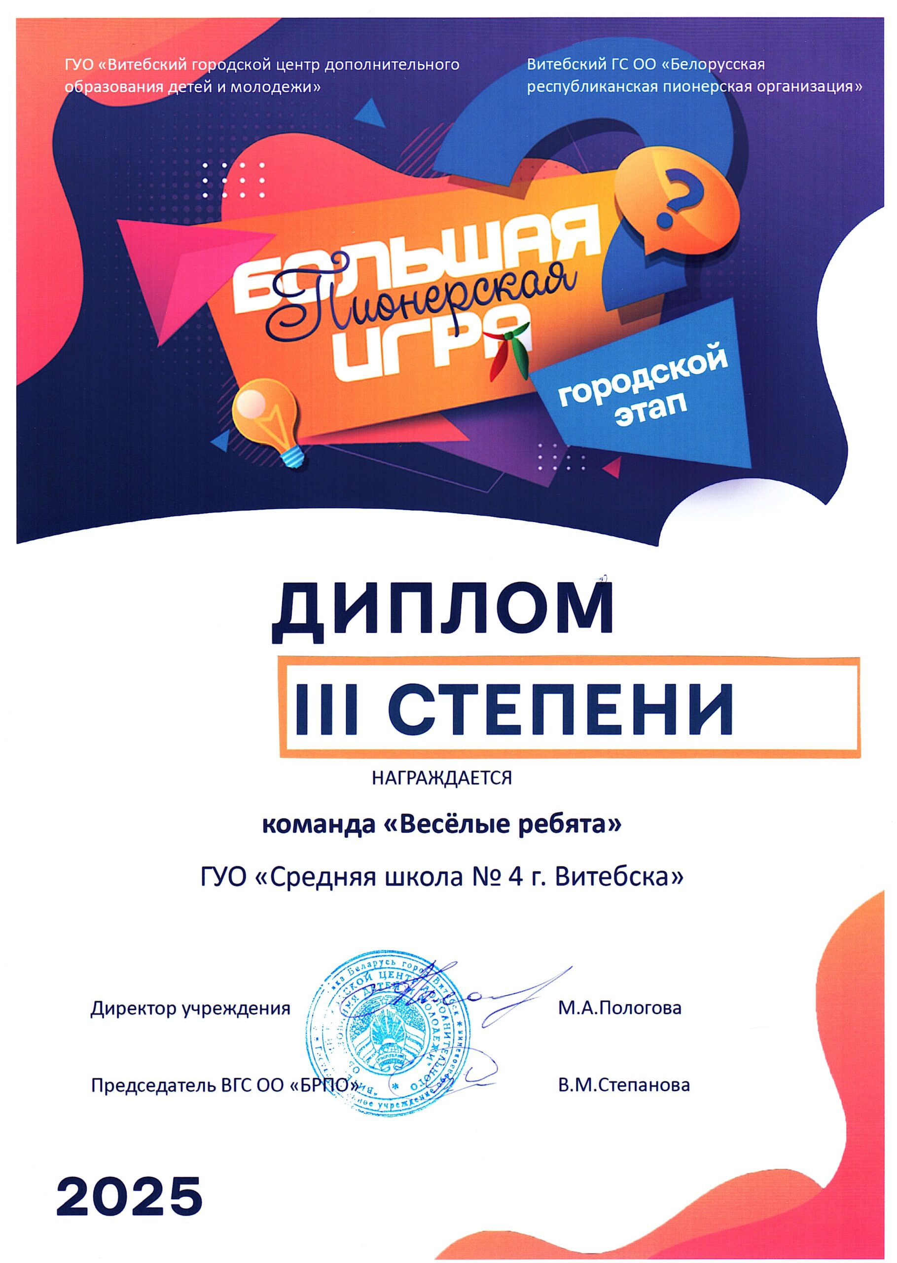 16.12.2025Поздравляем команду нашей школы «Веселые ребята» с победой (Диплом III степени) на городском этапе интеллектуально-развлекательной игры «БРПО», ОО «БРСМ» «Большая пионерская/молодежная игра»!