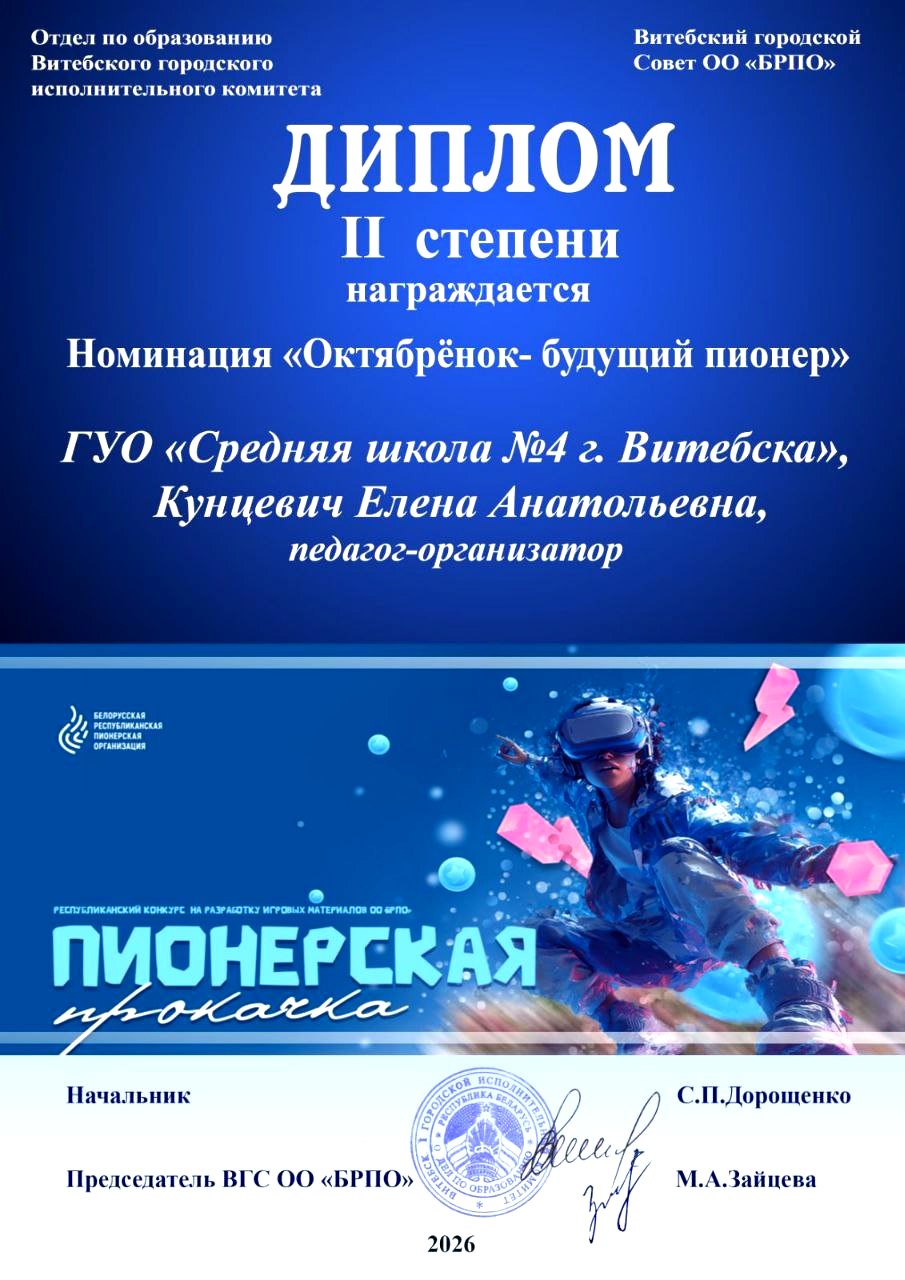 29.01.2026Поздравляем Кунцевич Е.А., педагога-организатора нашей школы, с заслуженной победой в республиканском конкурсе на разработку игровых материалов ОО «БРПО» «Пионерская прокачка» в номинации «Октябренок — будущий пионер»!
