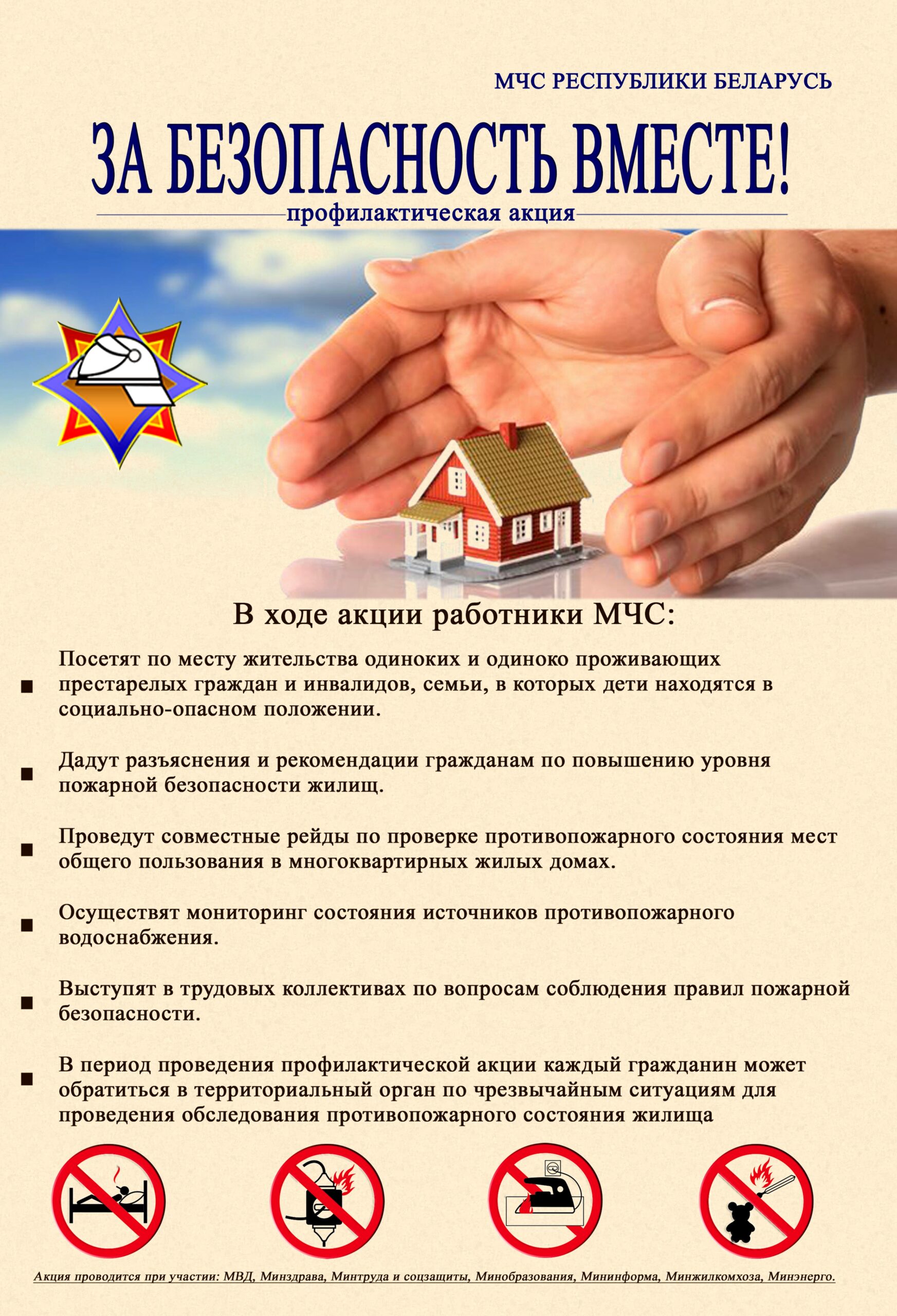 🔥Республиканская профилактическая акция проводится в период с 7 по 15 марта. В рамках профилактических мероприятий представители МЧС, органов внутренних дел, труда и социальной защиты, образования, жилищно-коммунального хозяйства, здравоохранения, энергетики и представители Белорусского добровольного пожарного общества будут проводить обследования жилых помещений граждан для выявления факторов, влияющих на безопасность жизнедеятельности, и оказания помощи в их устранении.
